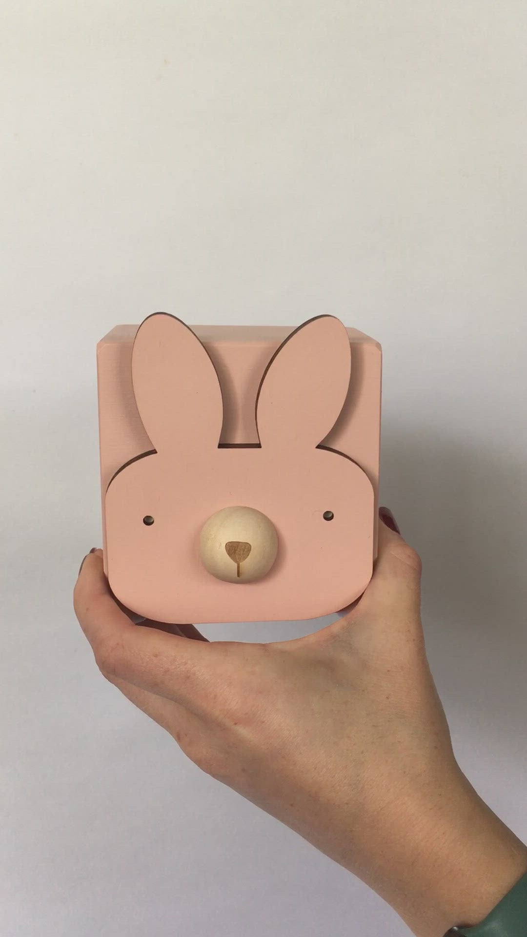 Off to dreamland your baby will go with a turn of this little bunny's tail. Plays up to three minutes on a full wind. Simple, sweet, and modern -- it makes cute room decor too. 3.5 x 3.5 x 4".