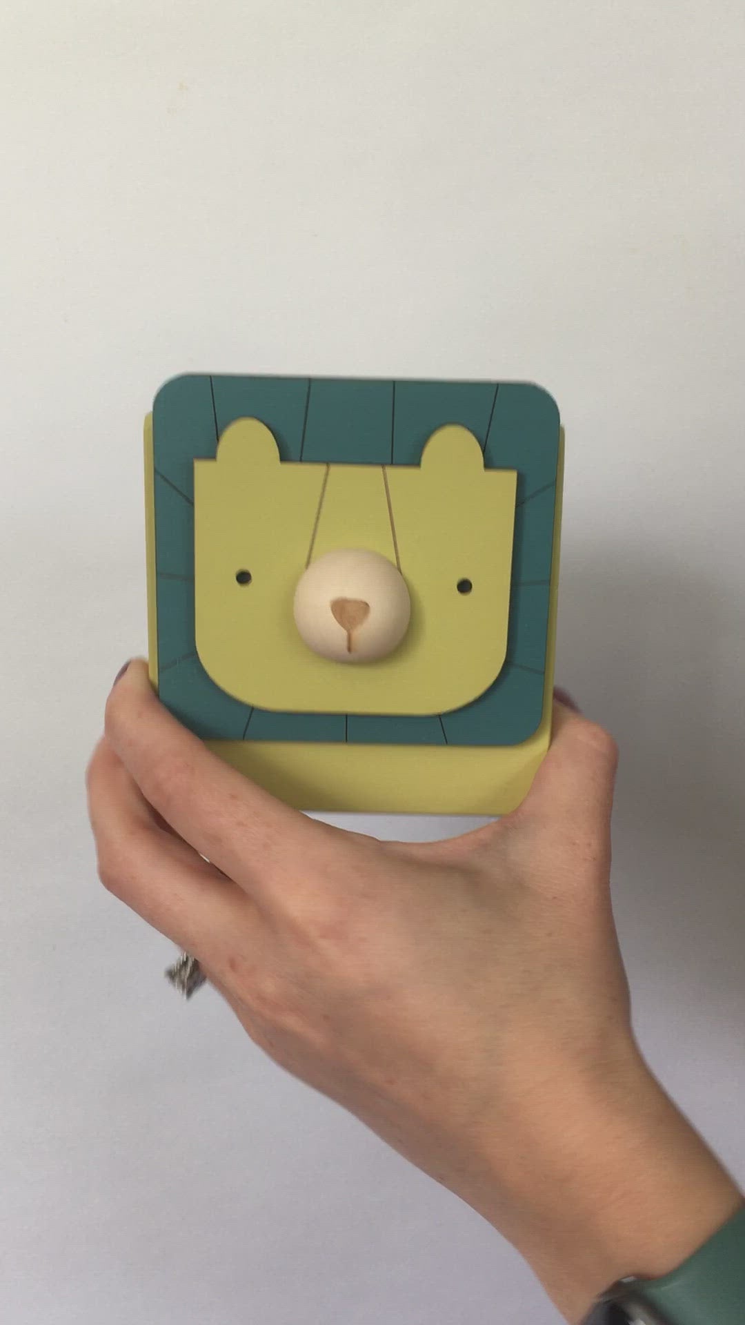 Off to dreamland your baby will go with a turn of this little lion's tail. Plays up to three minutes on a full wind. Simple, sweet, and modern -- it makes cute room decor too. 3.5 x 3.5 x 4".